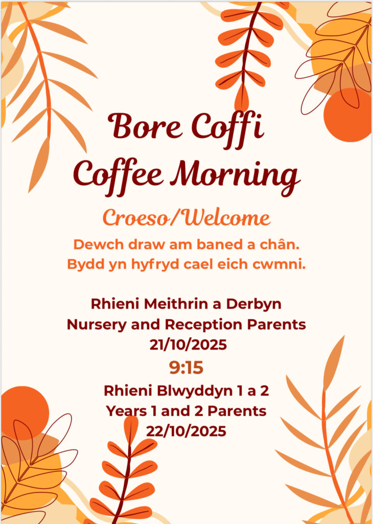 Wrth i ni nesau tuag at ddiwedd ein hanner tymor cyntaf, byddai’n braf cael eich cwmni gyda ni yn yr ysgol. Byddwn yn cynnal dau fore coffi, un i rieni a gofalwyr ein disgyblion meithrin a derbyn, ac un ar gyfer rhieni disgyblion blwyddyn 1 a 2. (Gweler y poster atodedig am fanylion pellach)