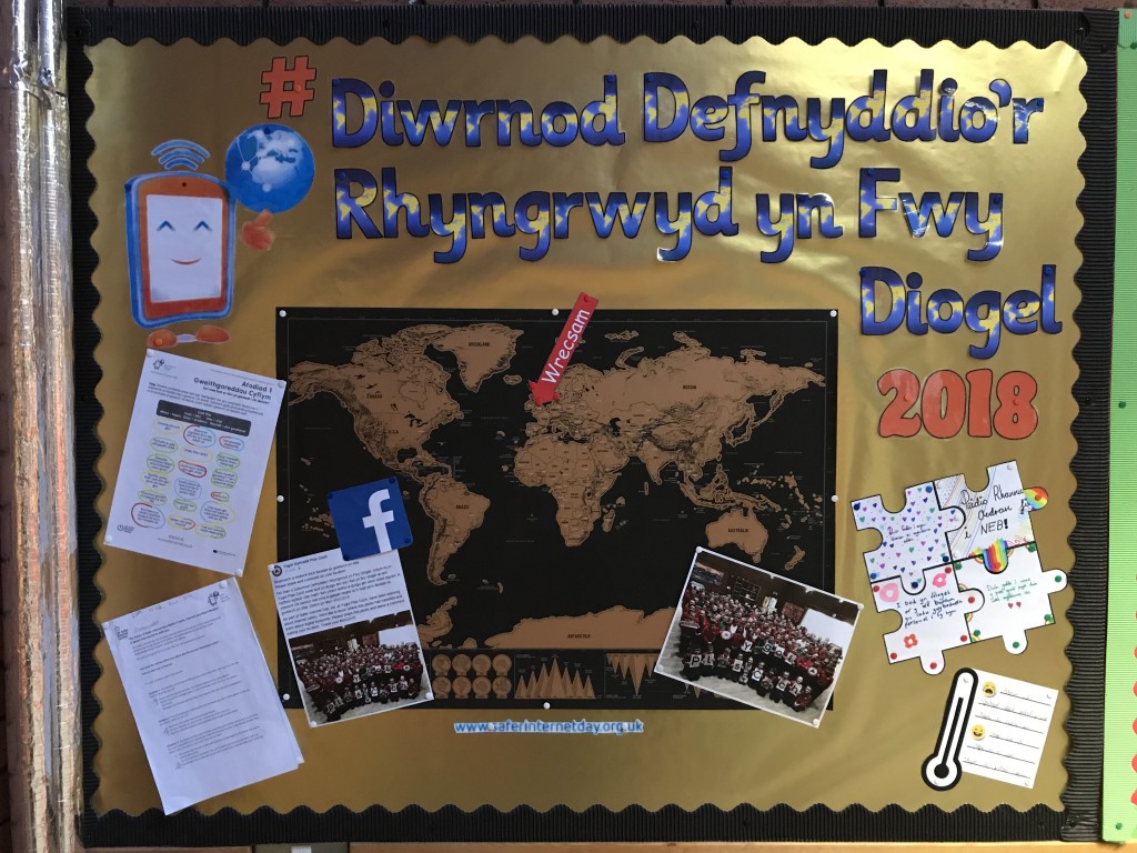 Er mwyn hyrwyddo Diwrnod Defnyddio’r Rhyngrwyd yn Fwy Diogel, mae’r disgyblion wedi bod yn rhan o weithgareddau yn ystod y dydd. Wedi gwasanaeth am ddefnyddio’r rhyngrwyd yn ddiogel a thynnu ffotograff i weld pa mor bell mae’n teithio ar Facebook, aeth y disgyblion o ddosbarth i ddosbarth yn dysgu sut i fod yn fwy diogel ar lein. Os am atgyfnerthu pwysigrwydd diogelwch ar y rhyngrwyd yn eich cartref, mae adnoddau dwyieithog ar gael ar y wefan www.saferinternet.org.uk