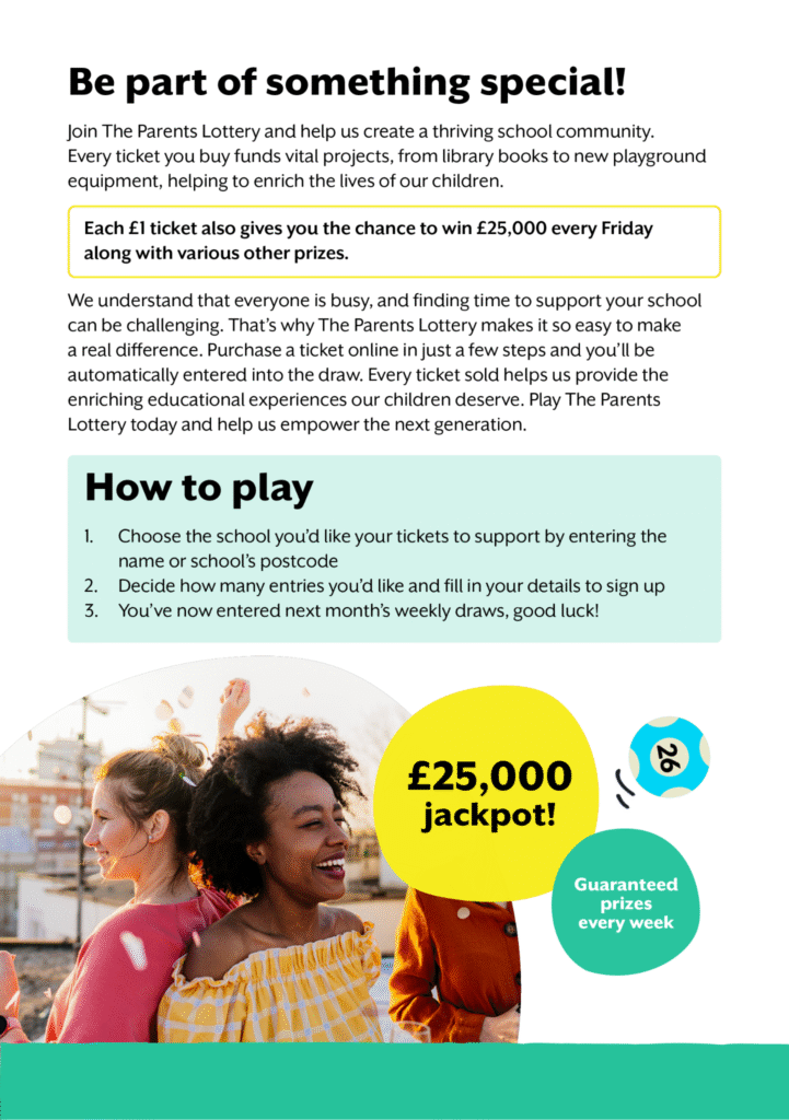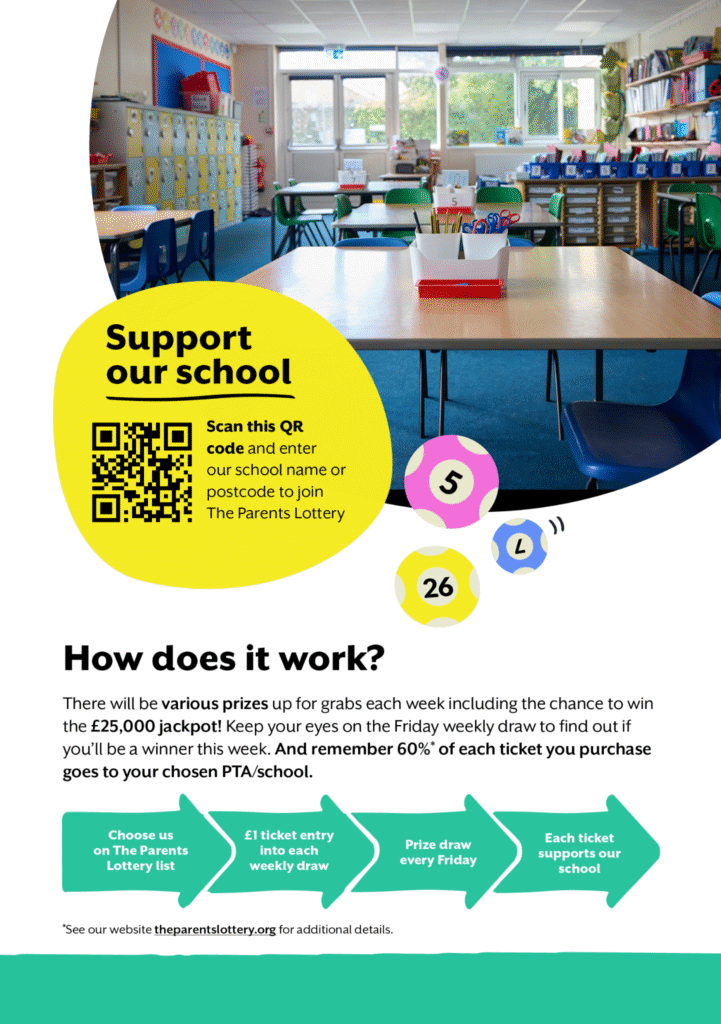 In order to raise much needed funds for the school, the PTA have registered with the Parents Lottery, which gives parents the opportunity to win weekly cash prizes, with a top prize of £25,000, while at the same time supporting the school. Details are below, including a link to register to play. Good luck!